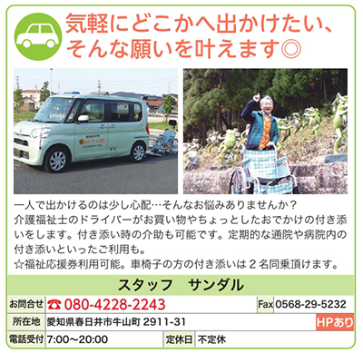 | 電話&FAX番号 | 080-4228-2243 固定電話:0568-44-2243 FAX:0568-29-5232 ※固定電話にお掛けの際は、春日井市外からの場合、必ず市外局番を入れてください。 |